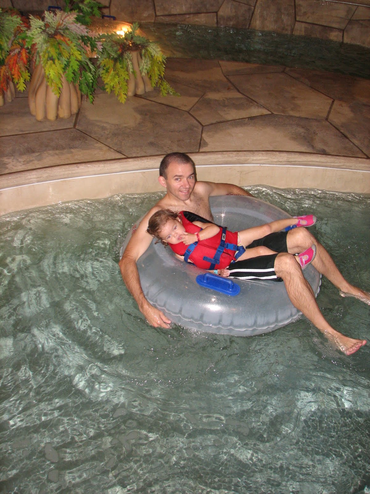 Sarah did not enjoy the slides very much but she liked relaxing with Daddy or playing in the shallow water. Her favorite part of the waterpark was the outdoor park. I think she liked it because it was warmer and there was more space for her to move without water splashing in her face. She was so easy going and happy on this trip. I would ask "Do you want to take a nap?" and she would reply "yes" and we would go back up to our room without her resisting. When it was time to leave she didn't need any convincing. She was ready to go! At the end of the trip I was following Sarah around in the baby pool and she took my hand and lead me out of the pool to a chair and told me to sit. I guess I was embarassing her or I was in her space. I sat down and watched her and she had fun playing make believe all by herself.